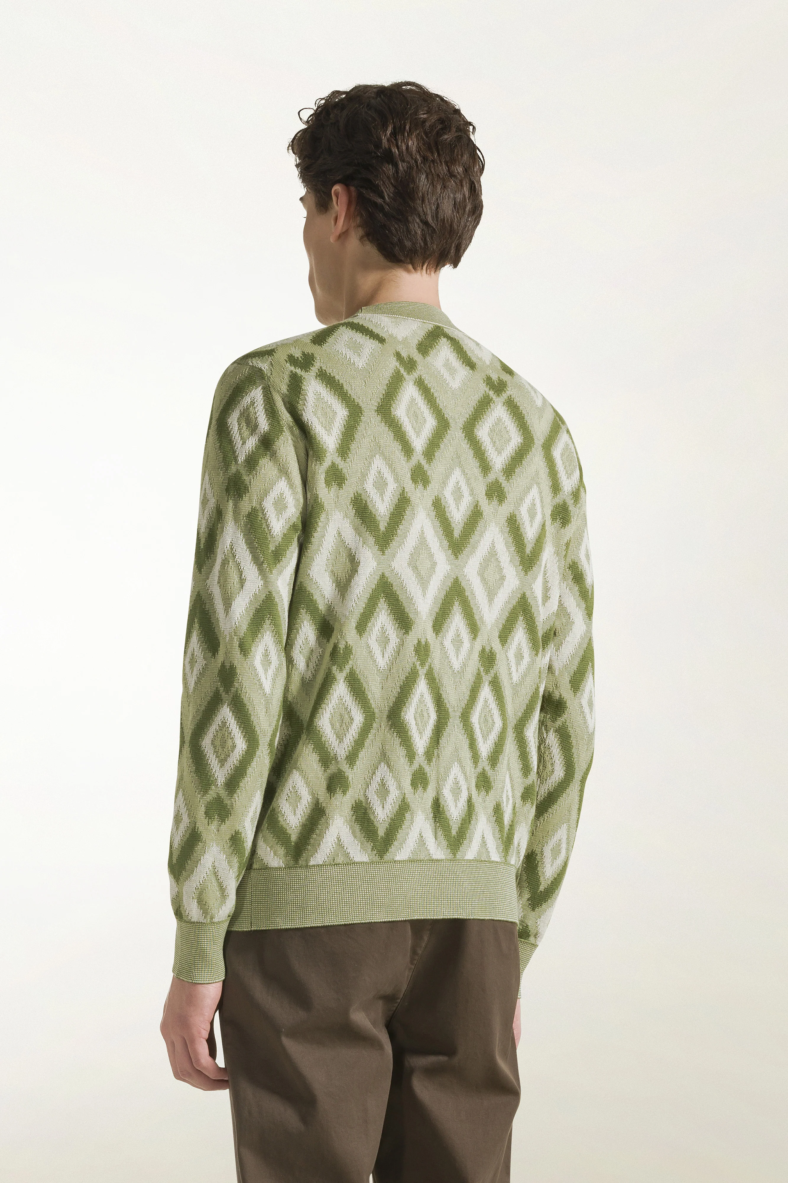 Morbido cardigan verde in Fil a Fil Ikat Argyle Jacquard, leggero e piacevole al tatto, con rombi sfumati che uniscono eleganza e comfort estivo.